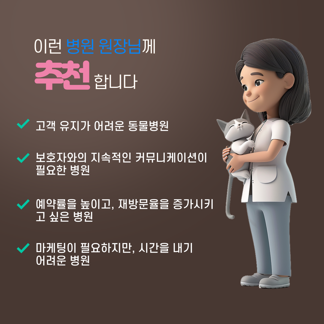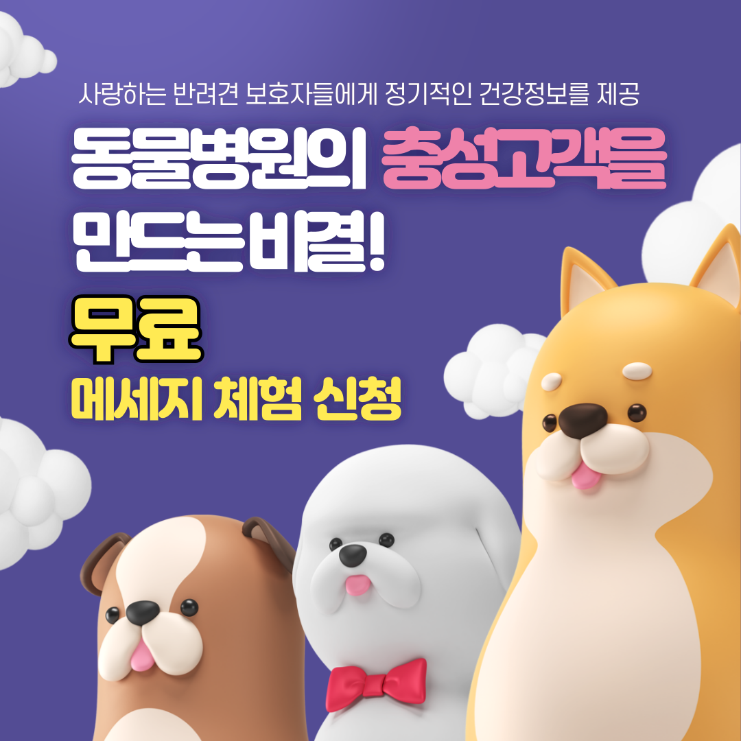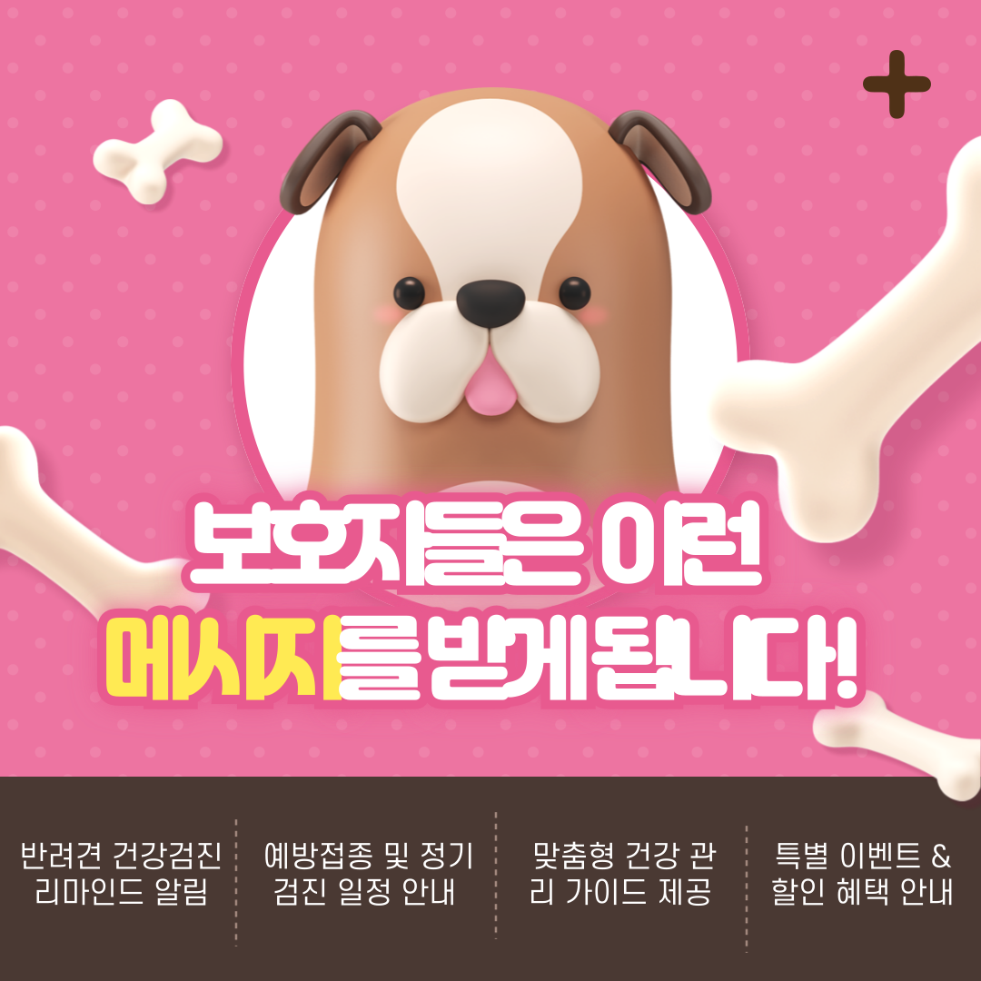 사랑하는 반려견 보호자들에게 정기적인 건강 정보를 제공하고, 병원의 단골 고객으로 만들 수 있는 기회! 보호자들이 메시지를 받으면, 자연스럽게 병원 방문을 고려하게 됩니다.