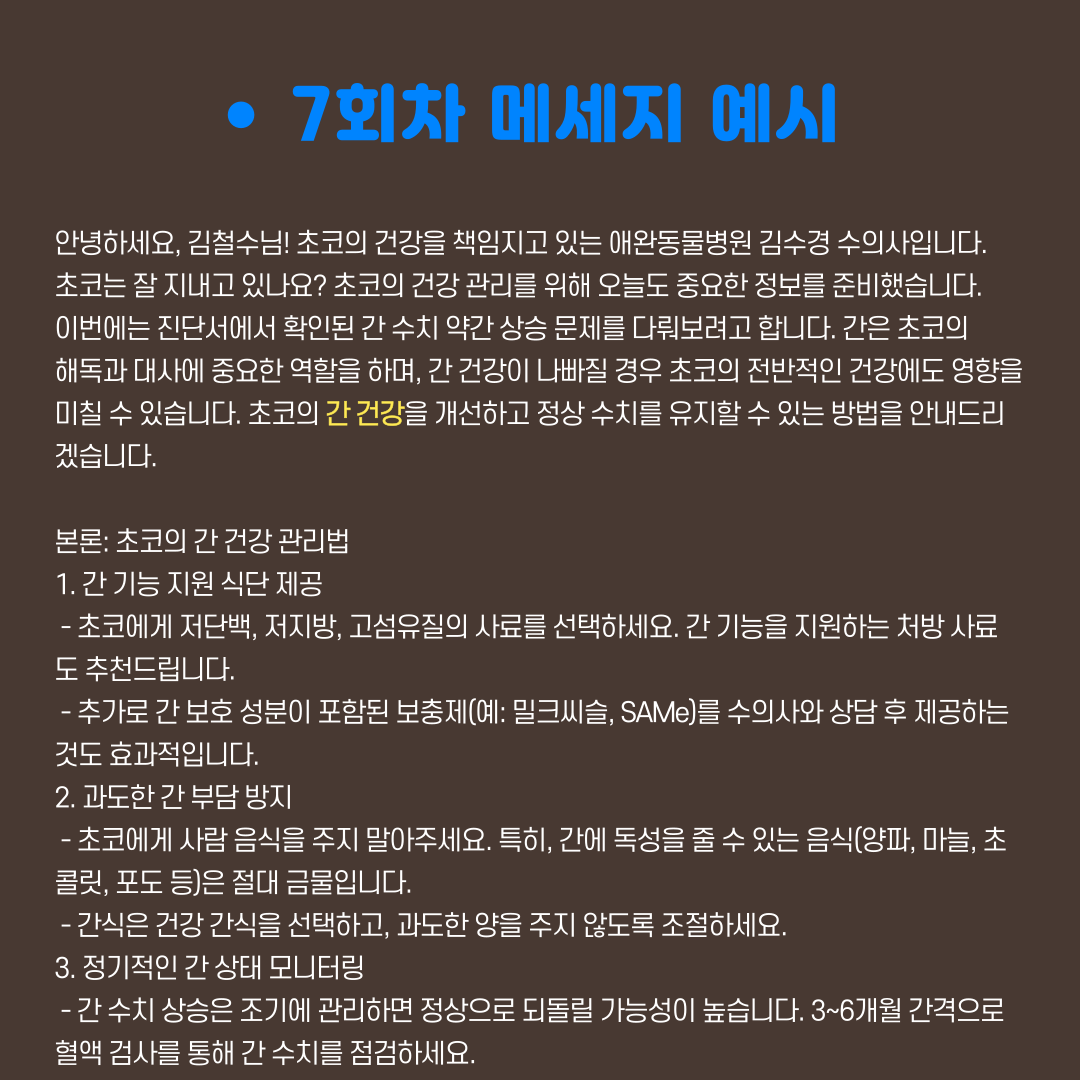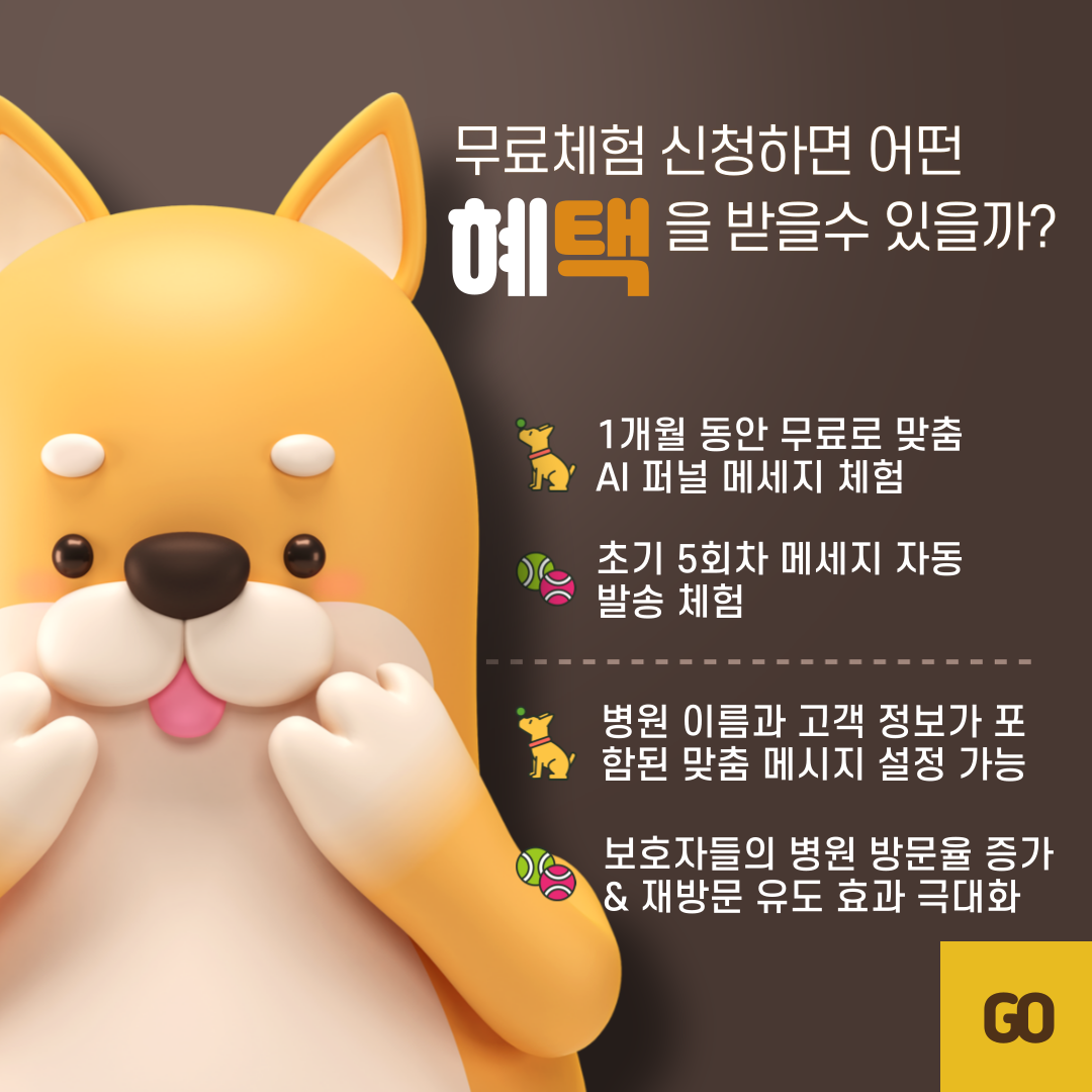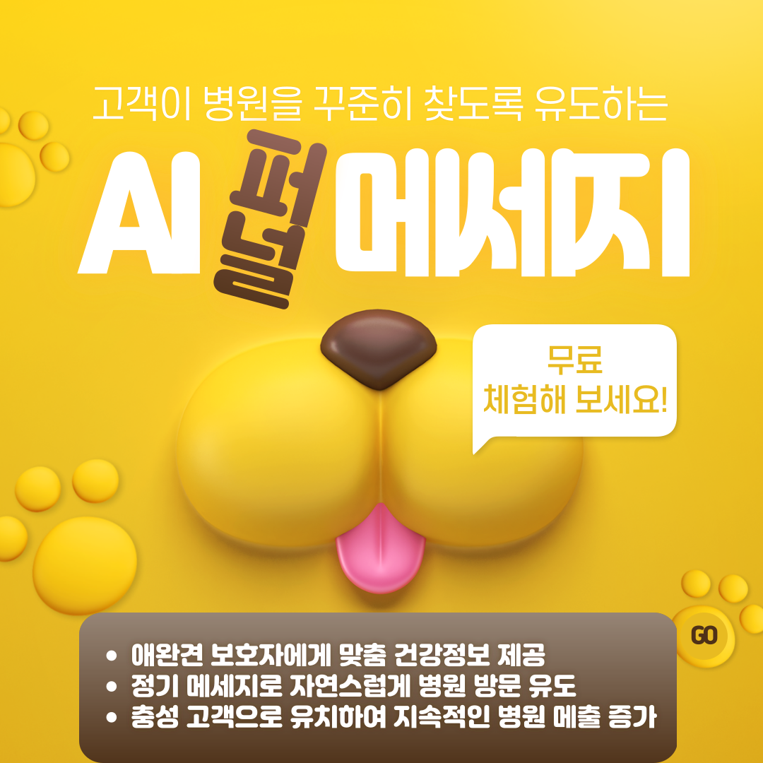 사랑하는 반려견 보호자들에게 정기적인 건강 정보를 제공하고, 병원의 단골 고객으로 만들 수 있는 기회! 보호자들이 메시지를 받으면, 자연스럽게 병원 방문을 고려하게 됩니다.